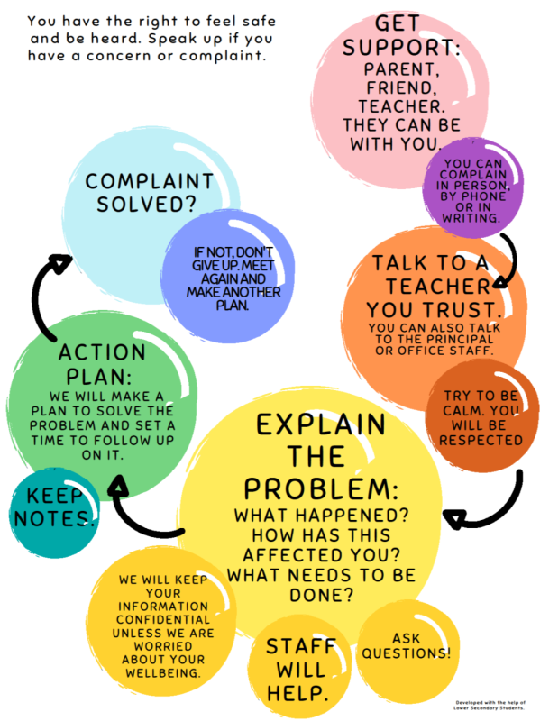 Sometimes, families or students may feel unsure of something or have a complaint they wish to raise with us. It is important to us to receive this feedback so we can address any issues or provide communication to support positive relationships. We encourage parents and caregivers to support the students in raising their complaints. All complaints will be heard, and will be investigated, and responded to by the person responsible. We do prefer to speak face to face, but complaints may also be made in writing, over the phone, or anonymously in writing. The level of investigation or response may be affected by the way in which the complaint is shared. Although they still provide important feedback, anonymous complaints will be harder to investigate and resolve.