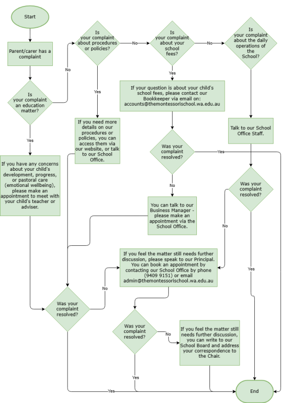 Most issues you can raise directly with the class teacher. Some issues may need to be brought to the School Office, to the Business Manager, or directly to the Principal. Complaints about the Principal should be directed to the Chair of the Board. If you are ever in doubt about how to raise a complaint, please ask a staff member to assist you. Below, you will find flow charts outlining how families can raise complaints, as well as how our students, both younger and older, can voice their concerns